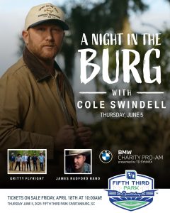 Home of the new Hub City Spartanburgers, Fifth Third Park officially opened its doors on April 1st, 2025. General Manager of the new minor league team, Tyson Jeffers, expressed his enthusiasm about Cole Swindell performing at the stadium. “We cannot wait to welcome Cole Swindell to Fifth Third Park for the inaugural concert as part of the tournament! This is a huge milestone for both the Hub City Spartanburgers and our vibrant community here in Spartanburg. Cole’s performance will be the perfect way to kick off this prestigious event, and we’re thrilled to provide fans with an unforgettable experience. Fifth Third Park is going to be an incredible venue for concerts like this, and we can’t wait to see everyone come together to celebrate the start of this weekend!”