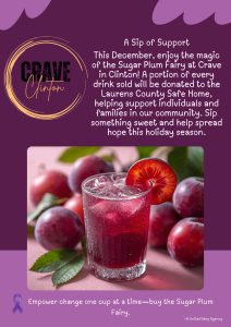 December 7, 2025Crave Clinton is adding extra sweetness to the season with a special drink that does more than delight taste buds. Throughout December, customers can enjoy the festive Sugar Plum Fairy, knowing that a portion of every drink sold will be donated to the Laurens County Safe Home.