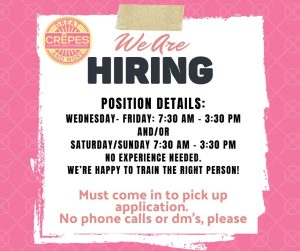 Now, Great Crêpes & More is looking to add to its team. Open positions are available for the following shifts: Wednesday through Friday, 7:30 a.m. to 3:30 p.m., and/or Saturday and Sunday, 7:30 a.m. to 3:30 p.m.