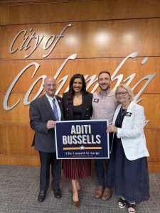Bussells emphasized her campaign will focus on real results for Columbia families and collaboration. Dr. Aditi Bussells is a public health researcher and was elected to Columbia City Council At-Large in 2021. Aditi and her husband, Louis Bussells, who is a Nurse Practitioner and veteran of the U.S. Army, have a son, Bodhi, and two dogs.