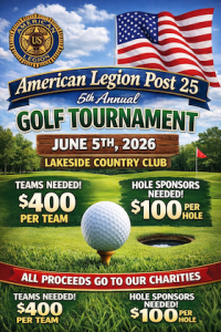 March 16, 2026The American Legion Post 25 is inviting golfers and community supporters to participate in its 5th Annual Golf Tournament, scheduled for June 5, 2026, at Lakeside Country Club.