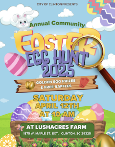 April 6, 2025Families are invited to join the fun at the Clinton Annual Community Easter Egg Hunt on Saturday, April 12, 2025, at 10:00 a.m. The event will be held at Lush Acres Farm, located at 1875 W. Maple St. Ext., Clinton.