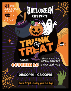 This special Halloween event includes three hours of jump time, spooky punch, and a snack — perfect for kids to burn off some energy while enjoying festive treats and activities. Families are encouraged to bring their own bag for treats as they make their way through the Trunk or Treat stations.