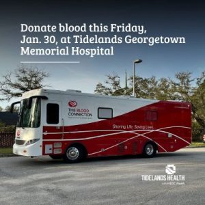 January 27, 2026Residents in Georgetown, Pawleys Island and surrounding areas are encouraged to donate blood this Friday, Jan. 30, at Tidelands Georgetown Memorial Hospital. The Blood Connection will be on-site from 10 am to 2 pm.
