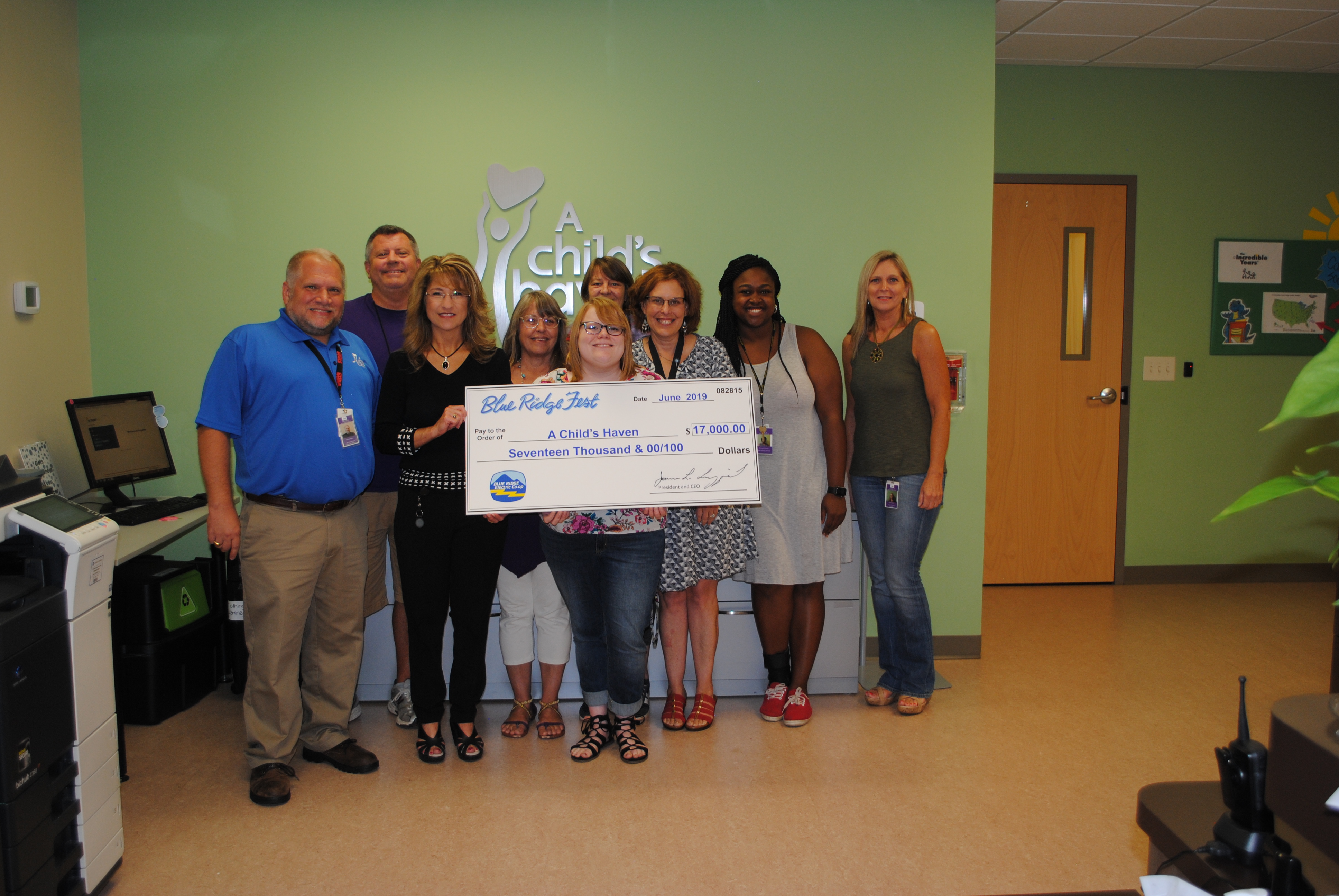 Blue Ridge Electric Cooperative employee Kandy Brooks presented a check for $17,000 from the 22nd annual Blue Ridge Fest to A Child’s Haven. Accepting the check on behalf of the organization is Executive Director, Laurie Rovin, along with staff members including Michael Beaver, David Rich, Teresa Baxter, Cynthia Wray, Julia Theiszmann, McKenzie Clemons and Ellen Crumbaker.
