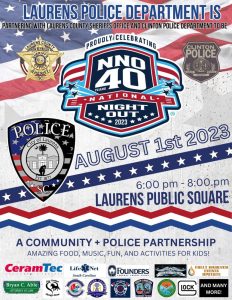 July 26, 2023The Laurens Police Department (LPD) is joining forces with the Laurens County Sheriff’s Office (LCSO) and the Clinton Police Department (CPD) for National Night Out (NNO) on August 1 from 6-8:00 pm on the square in Laurens.