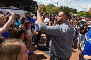 But on Wednesday, amid cheers from hundreds of fans, Bearcat players and coaches left campus fortheir last game of the season – the biggest game of all. Under spring’s blue skies, the crowd celebrated the March tournament play that had given way to April’s reality that only one game remained as they sent the team off to the “Natty,” the NCAA tournament final and the biggest game of the Bearcats’ lives to date.