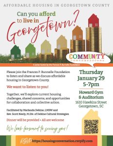 January 18, 2026The Frances P. Bunnelle Foundation is inviting community members, nonprofit leaders, advocates, and partners to take part in a Community Conversation focused on affordable housing in Georgetown County on Thursday, January 29 from 5:00 – 7:00 pm at Howard Gym and Auditorium (1610 Hawkins Street, Georgetown, SC).Â