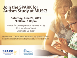 June 5, 2019The Center for Developmental Services (CDS) will host the MUSC SPARK for Autism Study on Saturday, June 29th from 9:00am-1:00pm.