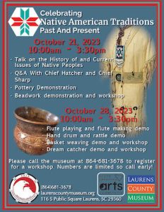 September 20, 2023The Laurens County Museum on the Historic Square in Laurens, SC, and the PAIA Lower Eastern Cherokee Nation will host the “Celebrating Native American Traditions Past and Present” arts programs on Saturdays, October 21 and 28, 2023. More programs will be held in March, 2024, with programs at the Museum and field trips for school children to the PAIA Lower Eastern Cherokee Nation of South Carolina tribal grounds on Warrior Creek Church Road in Gray Court. These wonderful programs with traditional Native American artists, dancers, musicians, storytellers, and speakers are made possible through a generous grant from the SC Arts Commission.