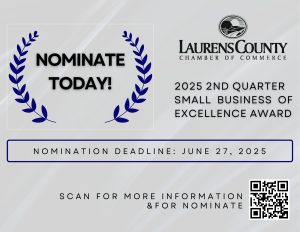 June 15, 2025The Laurens County Chamber of Commerce is now accepting nominations for its 2025 2nd Quarter Small Business of Excellence Award, recognizing a Chamber Member Business that sets the standard for excellence in customer service, community involvement, and professional integrity.