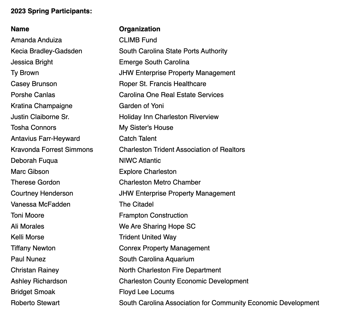 March 16, 2023The Charleston Metro Chamber is pleased to announce the Spring Diversity Leaders Certificate program participants. This informative program is designed to equip business leaders with the necessary tools and resources to thrive in the diversity, equity and inclusion (DE&I) space. Through the Diversity Leaders Certificate Program, participants will gain a better understanding of how they can lead as an equity-centered leader and make a larger impact on our community.