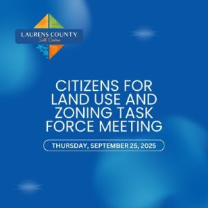 The Laurens County Citizens for Land Use and Zoning Task Force will convene on Thursday, September 25, 2025, at 6:00 p.m. at the Hillcrest Complex East, located at 105 Bolt Drive in Laurens.