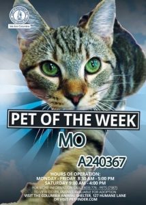Meet Animal Services’ new Pet of the Week, Mo. Mo is a 5-month-old, Domestic short-hair mix cat. He is good with other cats, VERY friendly and loves human interaction. This loving “furbaby” has already been neutered, micro-chipped, and is currently ready to meet his “furever” family.