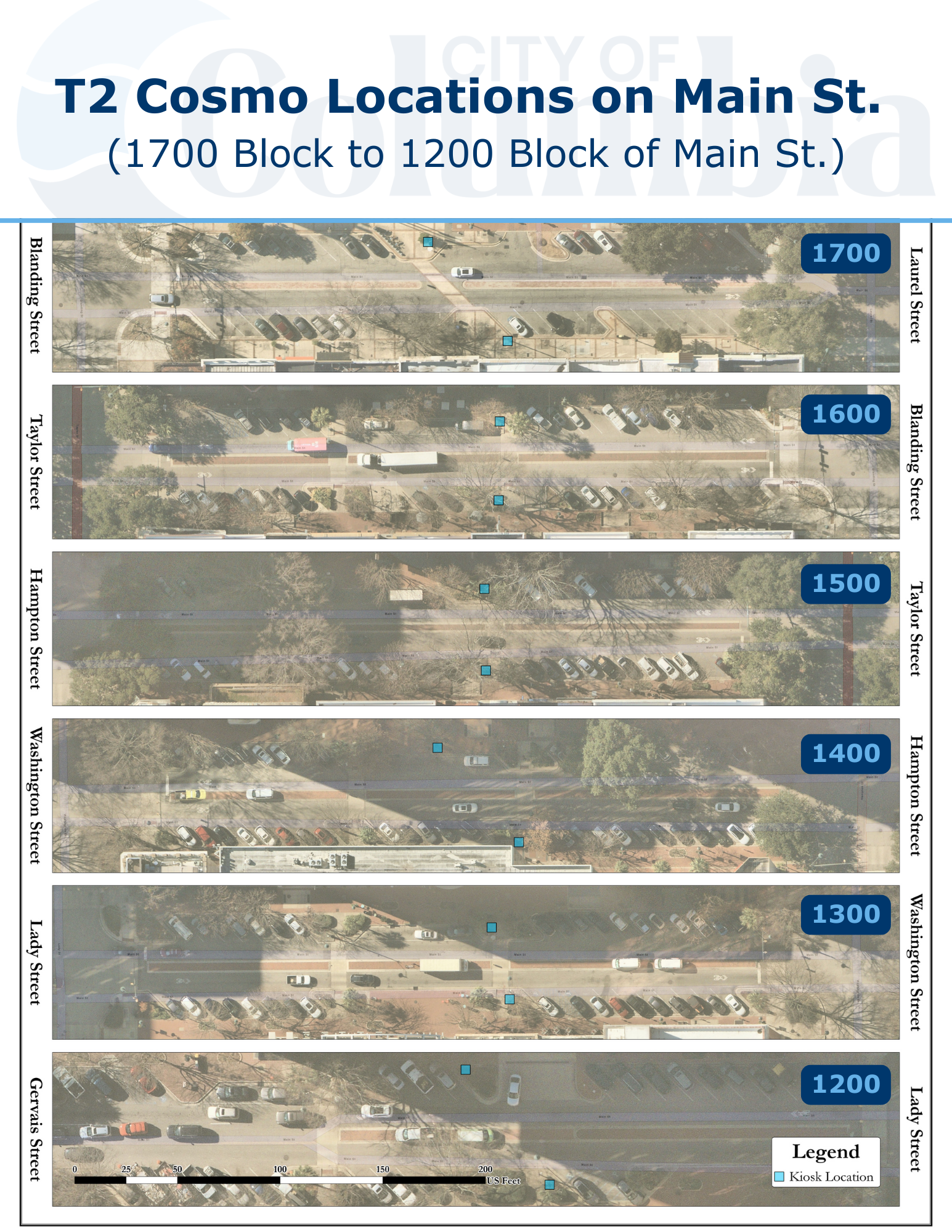The T2 Cosmo Pay Stations are to be strategically placed down Main St., as one pay station will be located on either side of the street starting from the 1700 Block of Main St. to the 1200 Block of Main St. The pay stations will also be located near the middle of the street, near pedestrian crosswalks, allowing for access that is more convenient.