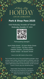 December 2, 2025The City of Charleston is pleased to announce the return of the Holy City Holiday Park and Shop Pass, offering residents two hours of free parking at select downtown garages during the 2025 holiday season. The pass will be valid from Wednesday, November 26 through Wednesday, December 31, 2025.Â