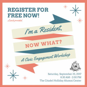 The city of Charleston will hold a civic engagement workshop, “I’m a Resident, Now What?” on Saturday, September 23, 2017 from 9 a.m. to 2 p.m. at The Citadel Holliday Alumni Center.