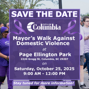 June 19, 2025The City of Columbia is now accepting sponsors for the upcoming 2025 Mayor’s Walk Against Domestic Violence, an annual walk focused on raising awareness, supporting survivors, and taking a stand against domestic violence.