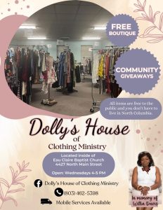 The press conference will also kick off the free mobile clothing drive organized by Dolly’s House of Clothing Ministry, located inside Eau Claire Baptist Church. The first stop of the clothing drive will be at Dorrah Randall Apartments on Saturday, April 26, from 10:00 a.m. to 12:00 p.m.