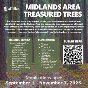 The Treasured Trees Program seeks to document and recognize trees that have significant value to the Midlands Area and to promote the awareness, benefits, and value of trees to the community. Trees can be located on public or private property in the Greater Columbia Metropolitan Area and can be nominated by anyone. However, the property owner of the tree’s location will need to be involved in the process.