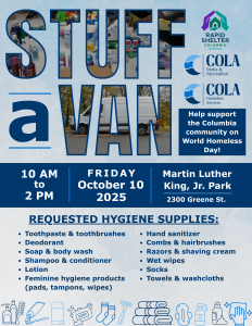 October 9, 2025On Friday, October 10, 2025, the City of Columbia Homeless Services Division in partnership with City of Columbia Parks and Recreation, invites the community to come together at Martin Luther King Jr. Park (2300 Greene Street, Columbia, SC) for a Stuff-a-Van event in honor of World Homeless Day.
