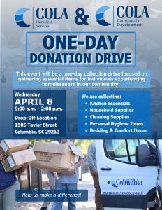 Where: Donation drop-off site: 1505 Taylor Street, Columbia, SC 29201
