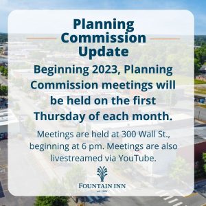 January 8, 2023The City of Fountain Inn recently announced that all Planning Commission meetings will be held on the first Thursday of each month, beginning in 2023.