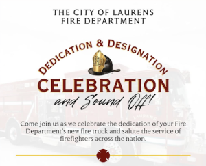 April 26, 2026The City of Laurens Fire Department will host a Dedication & Designation Celebration and Sound Off on Monday, May 4, 2026, from 5:30 to 7:00 p.m. at Laurens Public Square Plaza.
