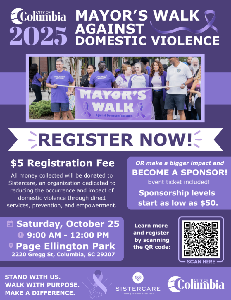 In addition the 2025 Mayor’s Walk Against Domestic Violence, the department is also hosting the third annual Toiletry Drive from August 1 – October 31, 2025, as well as two Sistercare Saturday events happening on August 9th and September 13th, 2025 from 10 a.m. – 12 p.m. at Boyd Plaza during the Soda City Market.