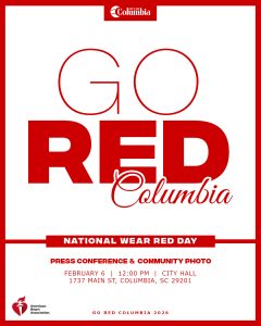 WHAT: Let’s have a heart to heart, about heart disease. The public is invited to participate in the City of Columbia’s Go Red for Women community photo op to help and support the women affected by heart disease, the number 1 killer of women.