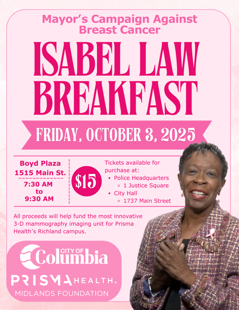 The City of Columbia will host the 2025 Isabel Law Breakfast on Friday, October 3, 2025, from 7:30 a.m. to 9:30 a.m. at Boyd Plaza, 1515 Main Street. Tickets are available for $15 at City Hall (1737 Main Street), Columbia Police Headquarters (1 Justice Square), and at the event. The breakfast includes grits, pancakes, bacon, eggs, sausage, hash browns, beverages, small bites, and, of course, great company!