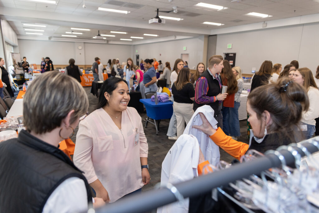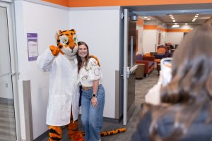 Students also took part in several milestone activities marking the beginning of their professional journey. They were measured for their formal white coats, tried on sample coats and toured the college’s new campus- including the Quattlebaum Hub and the Clinical Teaching building. Clemson’s Tiger mascot was also available for photos, providing a celebratory welcome to the University.