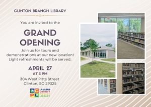 April 23, 2025The Laurens County Public Library System is excited to welcome the community to the Grand Opening of the new Clinton Library on Sunday, April 27, at 3:00 p.m.