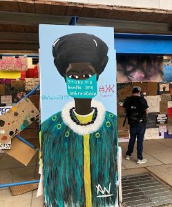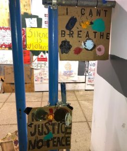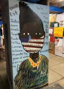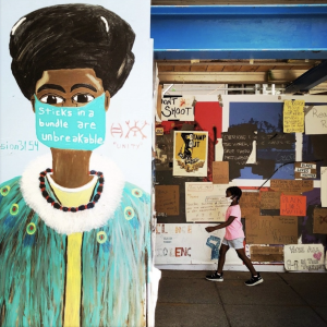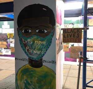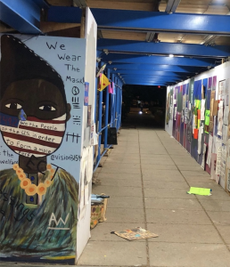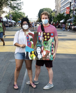 The following day while on his daily bike ride, Williams saw hate written all over the makeshift walls surrounding the U.S. Chamber of Commerce Building. It was then that he realized he could create a message of his own that is not filled with hate but conveys a message of unity. He saw those walls as his canvas. WIlliams rode his bike back home at the speed of light, packed his car with art supplies, and rushed back to Lafayette Square.