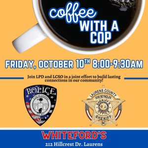 September 30, 2025The Laurens County Sheriff’s Office and the Laurens Police Department invite the community to join them for Coffee with a Cop on Friday, October 10, from 8:00 to 9:30 AM at Whiteford’s of Laurens, 212 Hillcrest Drive.