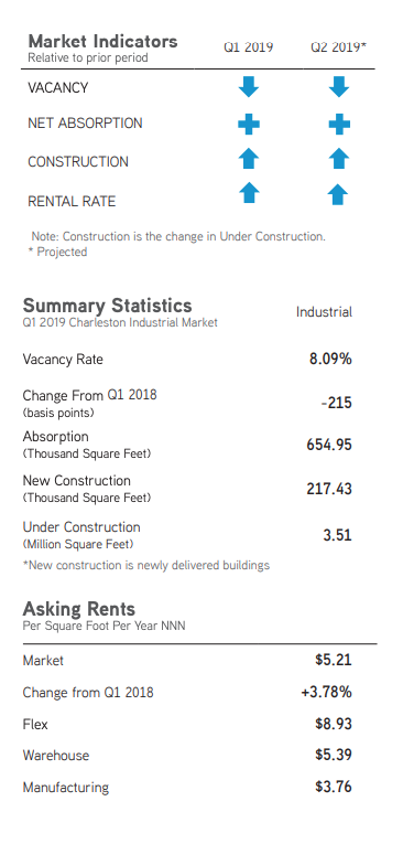• Demand for Charleston industrial space is rising; the market absorbed 654,951 square feet during the first quarter of 2019.