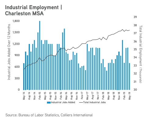 During the first two quarters of 2019, there have been $118.5 million of new capital investments within the Charleston industrial market. The capital investments produced 537 jobs, with the types of investors including varied manufacturing, shipping and logistics, and distilleries of craft beers. Also, according to the Federal Reserve data through May of 2019, there have been 9,500 jobs added in the Charleston metropolitan statistical area, 699 of which were industrial jobs. The manufacturing sector of industrial employment added 600 jobs and while the number of jobs being added is less than it previously was, the employment rate is 97%. Overall non-farm employment totals 372,700 and has increased 1.9% from May 2018 through May 2019.