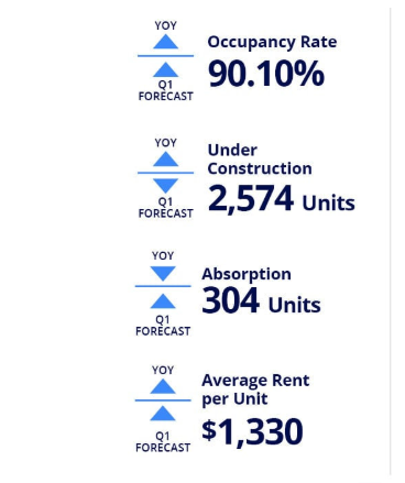 - Downtown is the construction epicenter as renters seek lifestyle amenities with nearly 1,200 units active or imminent