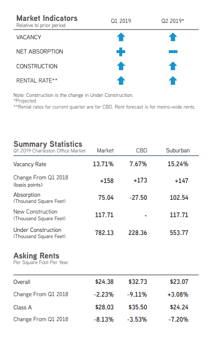 The Charleston suburban office market is comprised of 303 office buildings totaling 10,783,039 square feet and two buildings adding 117,714 square feet to the office suburbs were delivered this quarter. The suburbs are in high demand and absorbed 102,535 square feet this quarter, the Class A suburban market had the most activity and absorbed 94,856 square feet. Despite the positive absorption due to high demand, the suburban office vacancy rate rose from 14.78% during the fourth quarter of 2018 to 15.24% during the first quarter of 2019. New construction deliveries each quarter are causing the weighted rental rates to rise quarter-over-quarter. The overall suburban market average weighted rental rate for the remaining availabilities rose from $22.56 per square foot during the fourth quarter of last year to $23.07 per square foot this quarter.
