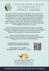December 16, 2025Community Foundation of the Lowcountry (CFL) is now accepting nominations for the 2026 Joan and Wade Webster Community Impact Award! Established in 2022 by CFL, with the generous support of Joan and Wade Webster, this award recognizes an individual within CFL’s service territory that has made a recent, significant positive impact in the Lowcountry through volunteering with an organization, nonprofit, or for a cause.
