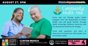 August 23, 2025The Clinton Branch is hosting a free Community Health Hub event aimed at supporting better health and wellness in the community. Join us on Wednesday, August 27, from 3:00–5:00 PM for an opportunity to meet a public health navigator from the South Carolina Department of Public Health. This event is open to adults aged 18 and older.