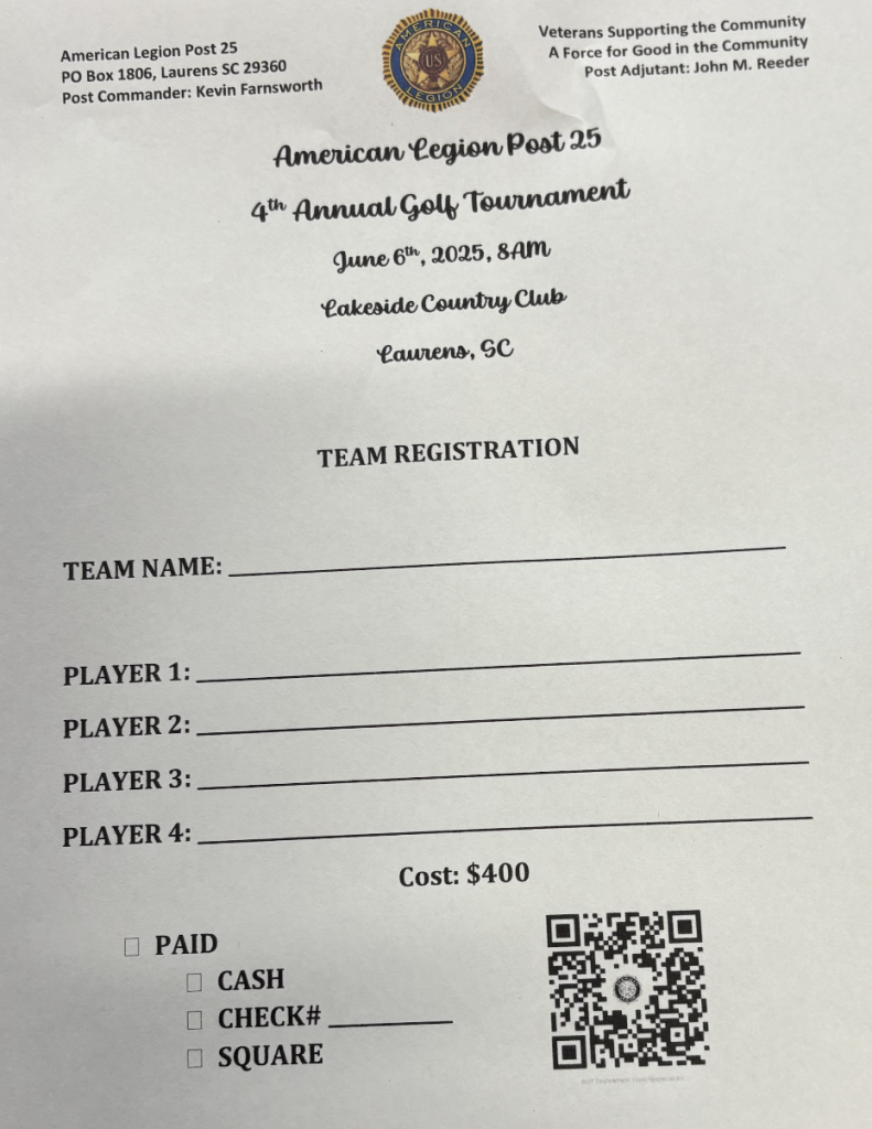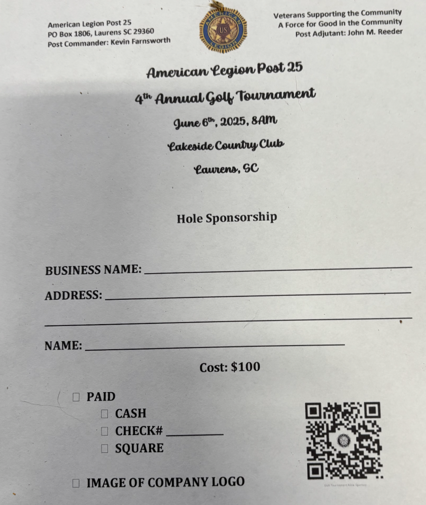 “This tournament is our biggest fundraiser of the year,” said Post Commander Kevin Farnsworth. “We’re incredibly grateful to the businesses that sponsor a hole at a cost of $100, and to all the volunteers who help make this happen. It takes about six months to organize, and we couldn’t do it without them.”