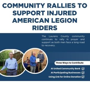 March 9, 2026One week after a serious motorcycle accident left two members of American Legion Post 25 riders with life-altering injuries, the Laurens County community continues to rally in prayer and support as both men face a long road to recovery.
