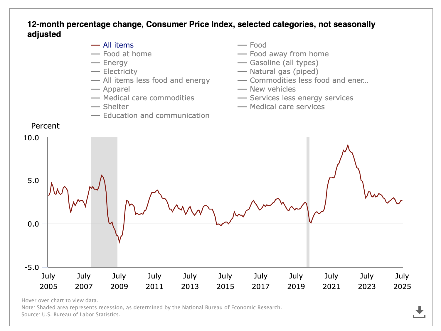 August 12, 2025The Consumer Price Index for All Urban Consumers (CPI-U) increased 0.2 percent on a seasonally adjusted basis in July, after rising 0.3 percent in June, the U.S. Bureau of Labor Statistics reported today. Over the last 12 months, the all items index increased 2.7 percent before seasonal adjustment.
