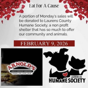 On Monday, February 9, a portion of sales at Arnold’s of Laurens will be donated to the Laurens County Humane Society(LCHS). The event offers residents a simple way to enjoy a meal while supporting animals in need across Laurens County.