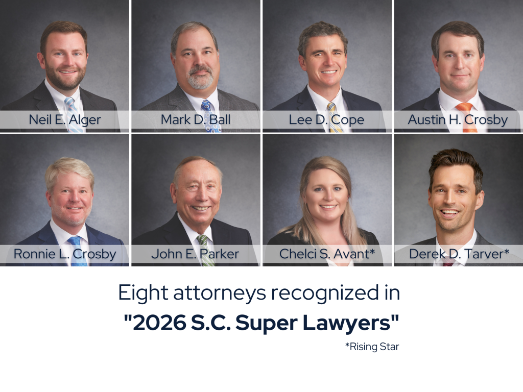 They also are recognized in South Carolina Super Lawyers, a supplement to the national rating service that highlights attorneys in the Palmetto State. The attorneys and the practice areas in which they’re listed are: