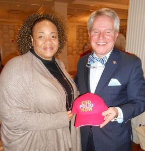 December 20, 2018End Polio Now – the global polio eradication initiative supported by Rotary International – continues to make steady progress against the dreaded disease. That message was delivered by Dr. Jimmie Williamson (at right in photo with Rotarian Melissa Lindler), guest speaker for Capital Rotary’s Dec. 19 meeting. Dr. Williamson, a longtime Rotarian and former District 7770 Governor for clubs in eastern South Carolina, was part of a polio immunization team operating out of northern India earlier in 2018. He said last year there were wild polio cases in only three countries: Pakistan, Afghanistan and Nigeria. Since 1988 there’s been a worldwide reduction in polio cases of 99.9%. But Williamson said immunization efforts are hampered now by cultural fears in Pakistan and Afghanistan. Rotary International helps provide funding, advocacy and mobilization for End Polio Now’s partnership that also includes the World Health Organization, the Centers for Disease Control, UNICEF and the Bill & Melinda Gates Foundation.