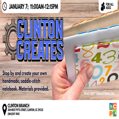 « All Events Clinton Creates January 7 @ 11:00 am - 12:15 pm « Art Group & Workshop Digital Art & Design @ Waccamaw Neck Branch Library » Stop by and create your own handmade, saddle-stitch notebook. Materials provided. 40 Add to calendar Google Calendar iCalendar Outlook 365 Outlook Live Details Date: January 7 Time: 11:00 am - 12:15 pm Event Category: Laurens County BUZZ Venue Laurens County Library 107 Jacobs Hwy # A Clinton, SC 29325 Phone 8646817323 Organizer Laurens County Library Clinton Branch