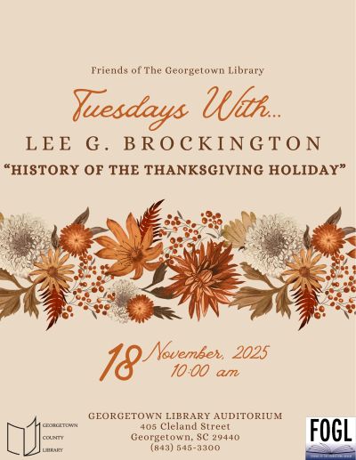 Our November Tuesdays With… presentation will feature Lee Brockington speaking on “History of the Thanksgiving Holiday.”
