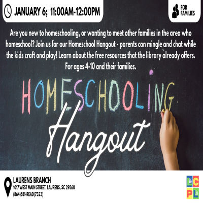 Are you new to homeschooling, or wanting to meet other families in the area who homeschool? Join us for our Homeschool Hangout – parents can mingle and chat while the kids craft and play! Learn about the free resources that the library already offers.